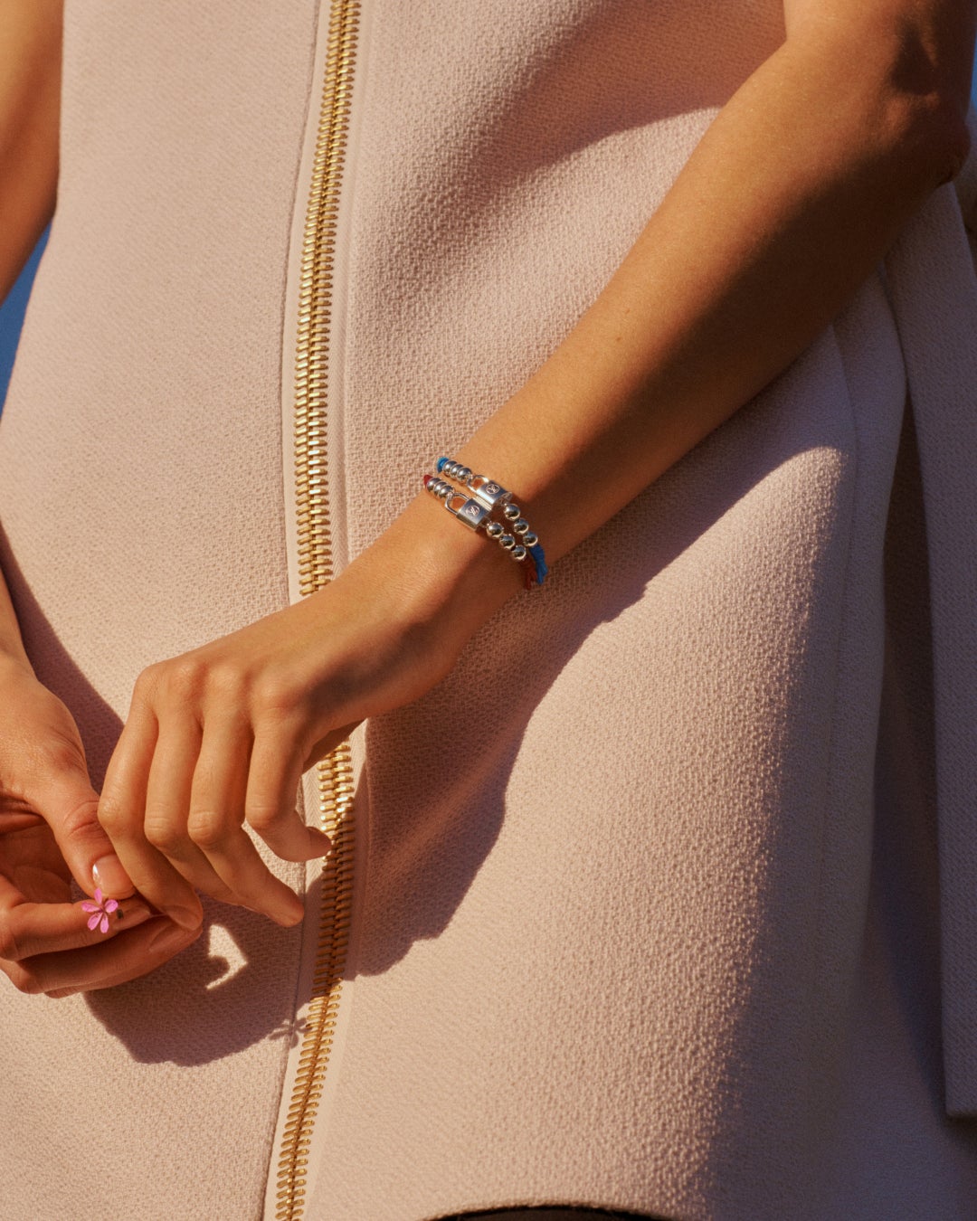2023 年、セミビーズブレスレットとして生まれ変わった「シルバー・ロックイット」の新作は、単体ではもちろん、重ね着けもお楽しみいただけるデザイン。数多くの受賞歴を誇る女優クロエ・グレース・モレッツがこのブレスレットを着用し、屋外にて撮影されたキャンペーンイメージは、いずれのショットも、この最新作のカジュアルで多彩な魅力を存分に反映した自然な表情のポートレートに仕上がっています。