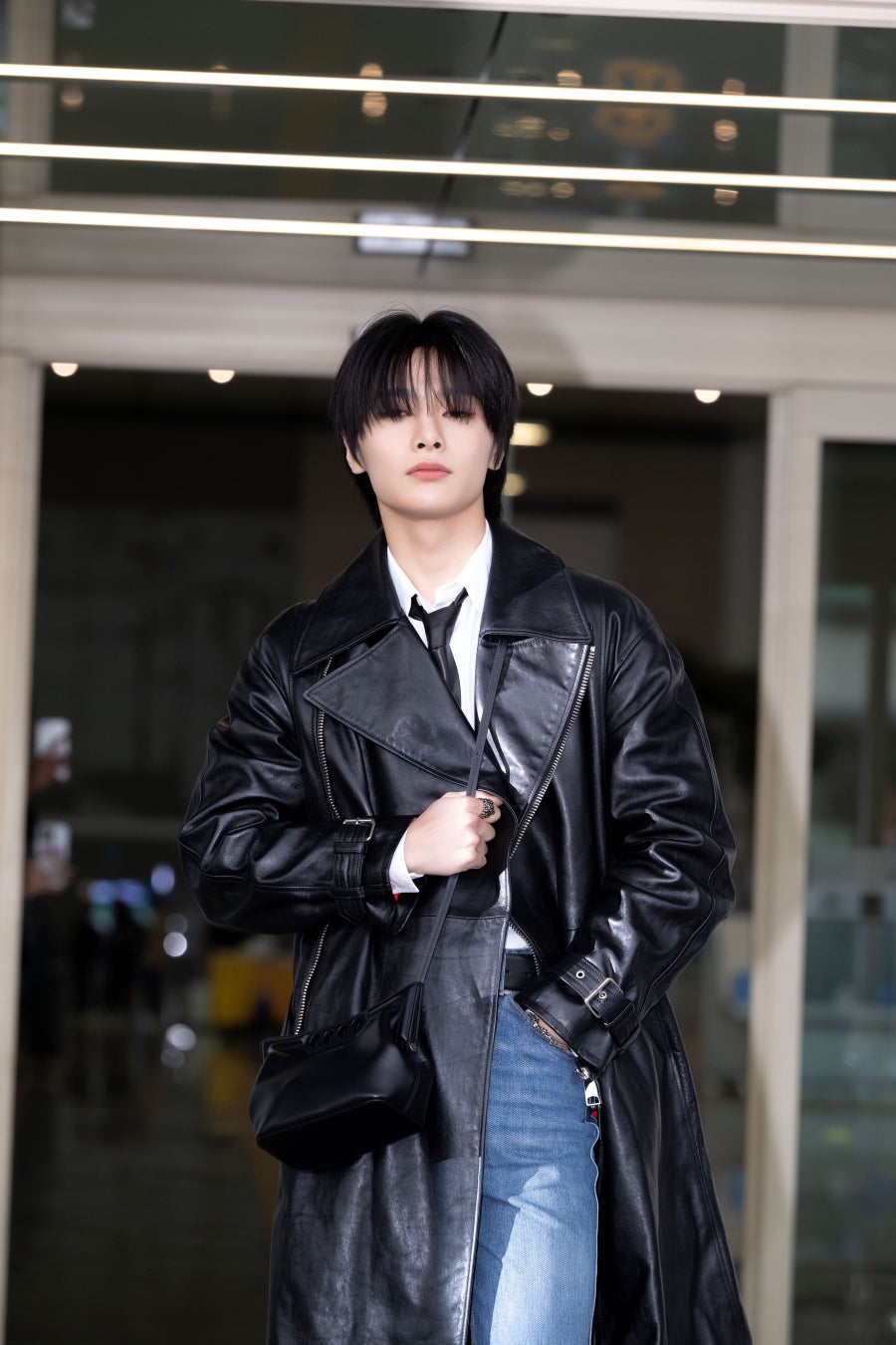 韓国ソウル仁川空港にて、Stray KidsのI.Nが2024年春夏コレクションよりシルバーメタルのジップをあしらったブラックレザーのトレンチコート、ホワイトシャツ、デニム、レザータイにバイカーブーツ、シルバーのジュエリー、新作の「Peak」 Miniバッグを合わせて着用し登場しました。