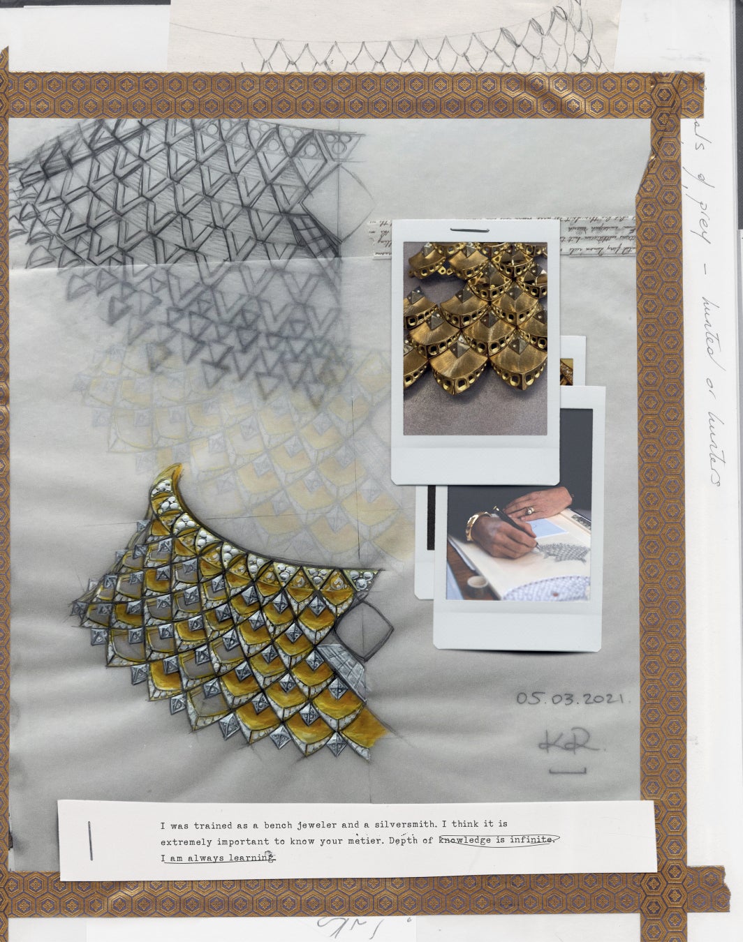 本書では、こうした4つの類い稀なジュエリー コレクションの魅力に迫り、素材とインスピレーションから洗練されたジュエリーにいたるまでの錬金術的な旅を丹念に描き出します。日記風のスタイルで綴り、独自のスケッチ、グワッシュ画、コラージュ、私蔵写真で彩られた「Fantastical Jewels」は、アムフィテアトロフがジュエリー製作という伝統的な手仕事に、いかにして現代性を吹き込んできたかをご紹介。また、自身が辿ってきた道のりと、トランクや旅に深く根差したメゾンであるルイ・ヴィトンの先駆的で先見性のあるエスプリに裏打ちされた創意工夫とのシームレスな融合を明らかにします。またアムフィテアトロフは、著名なアートディレクター ファビアン・バロンとのコラボレーションにより、自身のユニークな芸術的才能を映し出す、印象的かつパーソナルな作品を創り上げ、リボンタイのクロージャーや羊皮紙製のインサートをあしらった他に類を見ないラグジュアリーなパッケージに封入しました。
