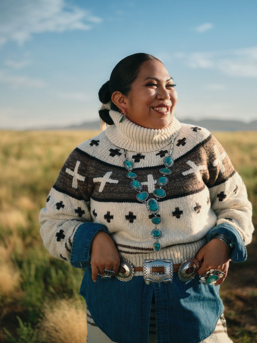 ナイオミ・グラシズは次のように述べています。「ナバホ族の織物は、私の一族が7世代にわたって受け継いできた工芸品であり、こうした伝統を新しい方法で守っていくことは、アーティストとしての私に大きなインスピレーションを与えてくれました。今、私の目を通して眺め、服として命を吹き込まれた、そうした工芸を世界中の人々と分かち合うことができるなんて、夢のようです。このコレクションが実現したのは、コラボレーションの力とラルフ ローレンのユニークなプログラムによるものであり、ナバホ族の伝統的な織物を新しい世代に伝えることができるというのは、何よりすばらしいことです。」