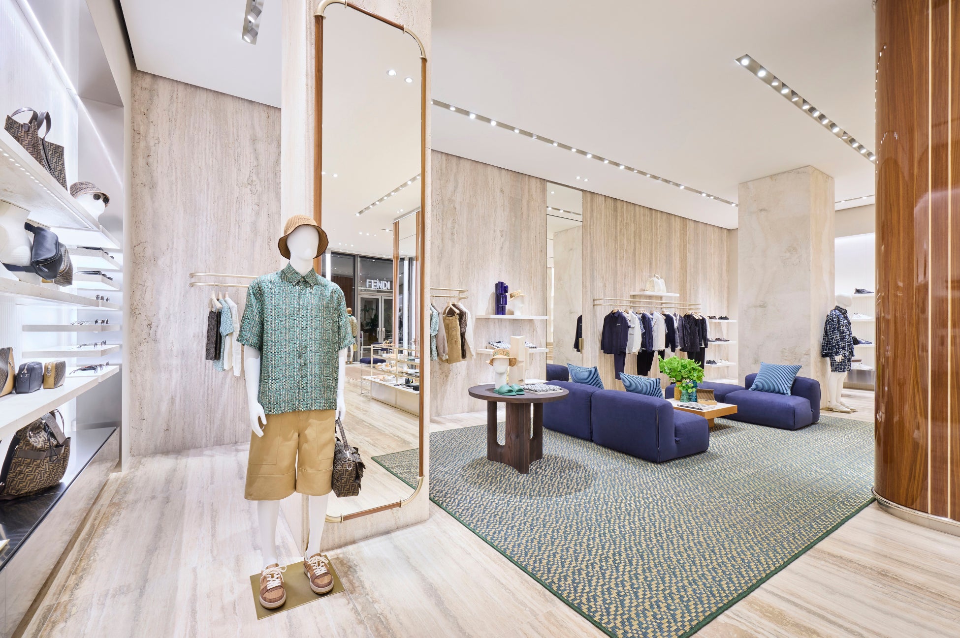 店内に足を踏み入れると、海の世界をイメージした豪華な美学と世界観でゲストをお迎えします。店舗の中央には、アッシュ材とチーク材で作られた立体的でユニークなキューブが設置され、ボートのデッキを思い起こさせます。店内の2つの試着室は、航海をイメージしたハンドルのついたドアから入室でき、その横には、フェンディのアイコニックな数々のハンドバッグが、クロムメッキのディテールを施したエンボス加工のファブリックニッチに展示されています。