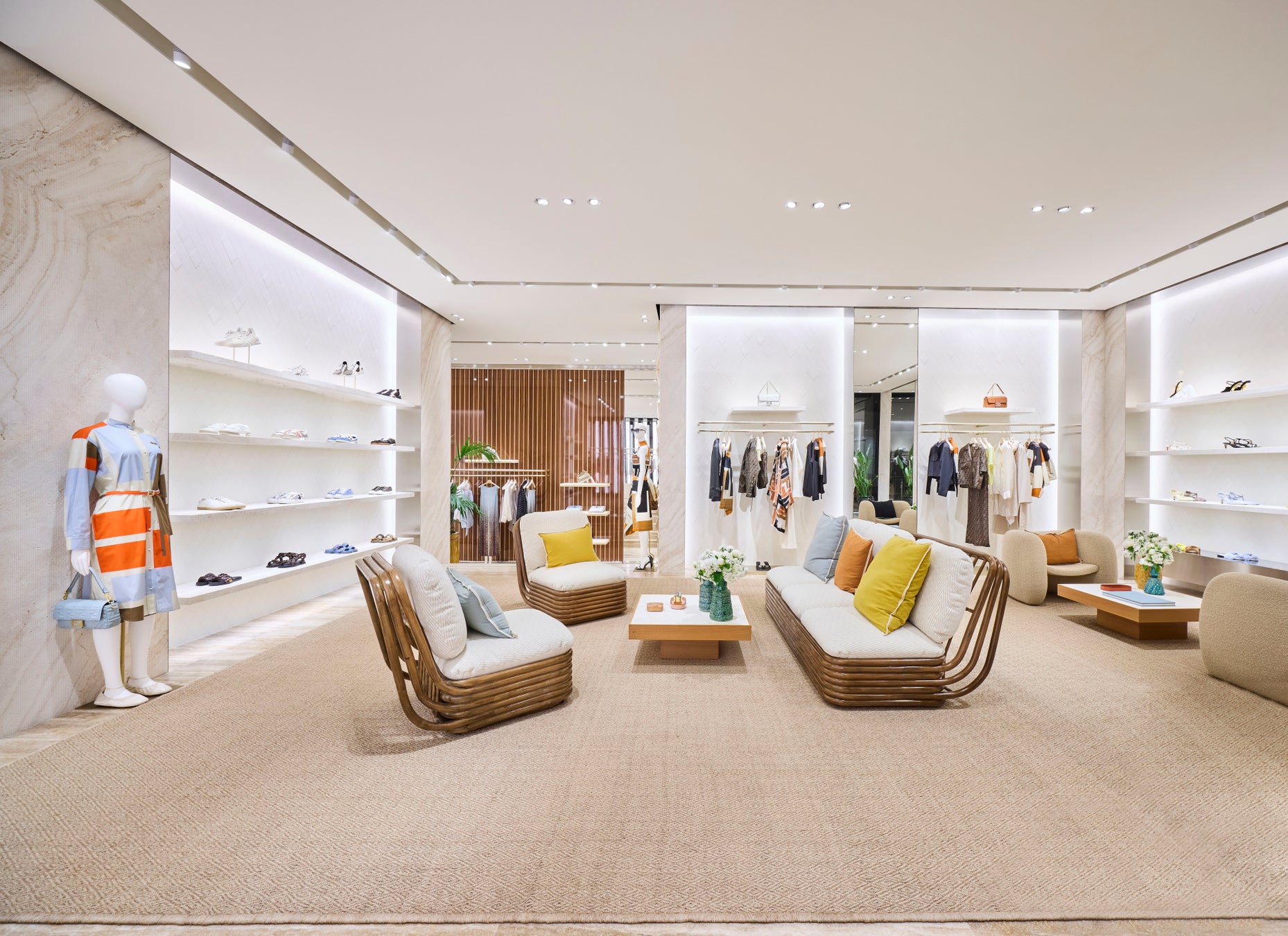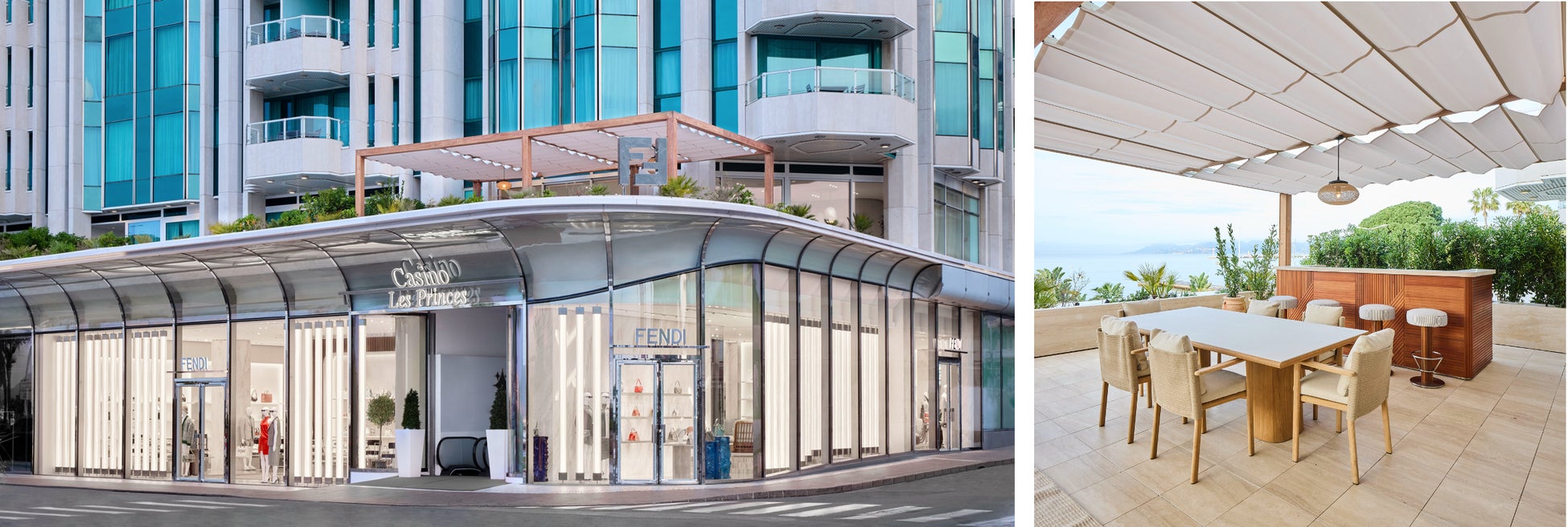 フェンディの世界観とフレンチリビエラの魅力が出会う510平方メートルに及ぶスペースには、ウィメンズとメンズコレクションのフルラインナップが陳列され、ユニークな雰囲気の中でお楽しみいただけます。2階にはVIPルームとプライベートテラスが用意され、クロワゼット(Croisette)の美しい海辺の景色を眺めることができます。店舗のデザインコンセプトは、フェンディの建築部門により開発されました。