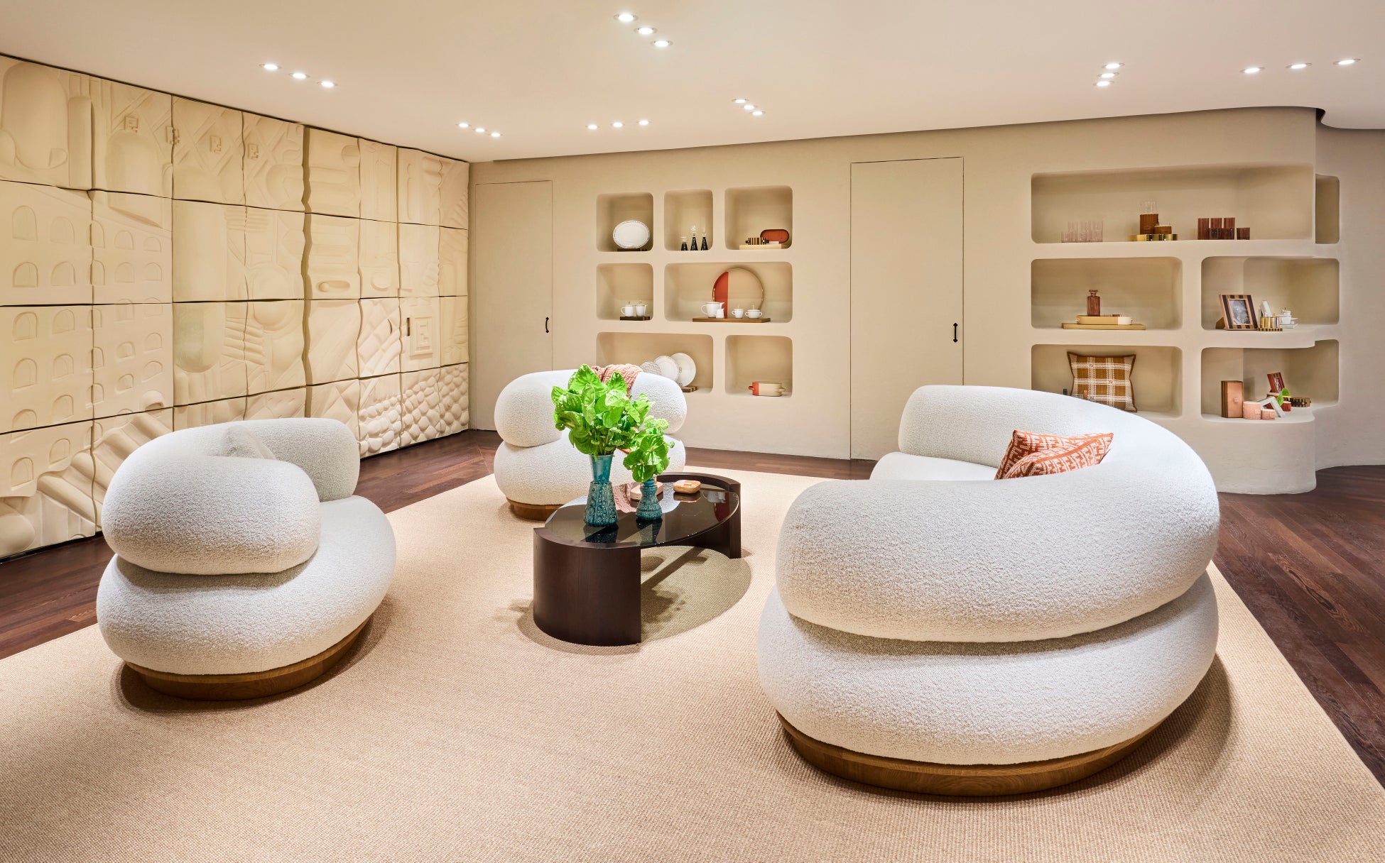 屋内のVIPスペースを補完するかのように、壁一面にオリヴィア・コグネ(Olivia Cognet)がフェンディのDNAを解釈してデザインした、特注ハンドメイドの陶芸作品が飾られています。このデザインには、「FF」ロゴ、ひし形パターン、古代ローマ建築の典型的なアーチデザインなど、フェンディを象徴する要素が、波や幾何学的なモチーフと組み合わせられています。オリヴィア・コグネが手がけた陶磁器における地元のノウハウや魅力は、階段に設置された専用デザインの壁面彫刻や、特別展示コーナーに置かれたブルーとグリーンの花瓶やトーテムなど、ブティック全体に広がります。