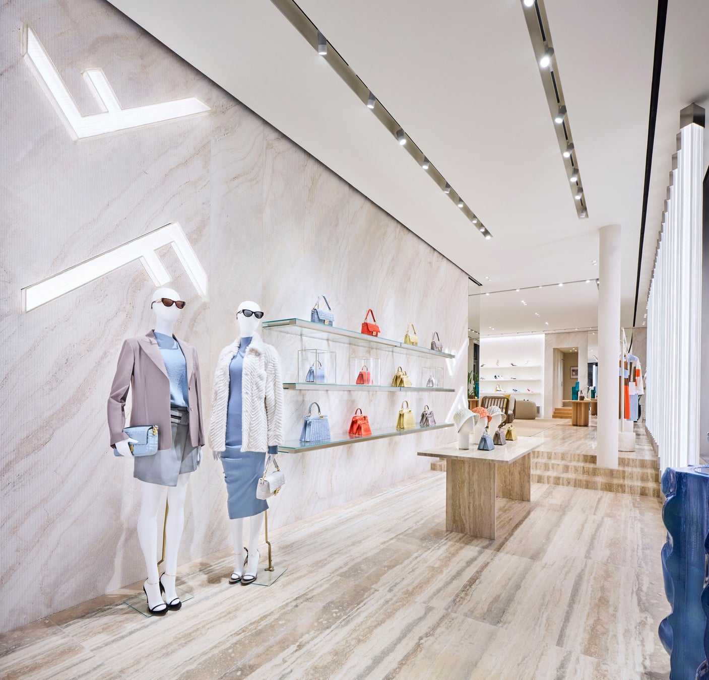 外からも見通せるエントランスのレザーグッズコーナーは、ハンドメイドの質感が特徴のガラス製「FF」ロゴランプと棚により明るく開放的な雰囲気が演出されています。水面の反射をイメージしたデザインは、ファサードのランプと連続性を持たせ、広々としたブティックの窓から差し込む光は空間を満たしています。