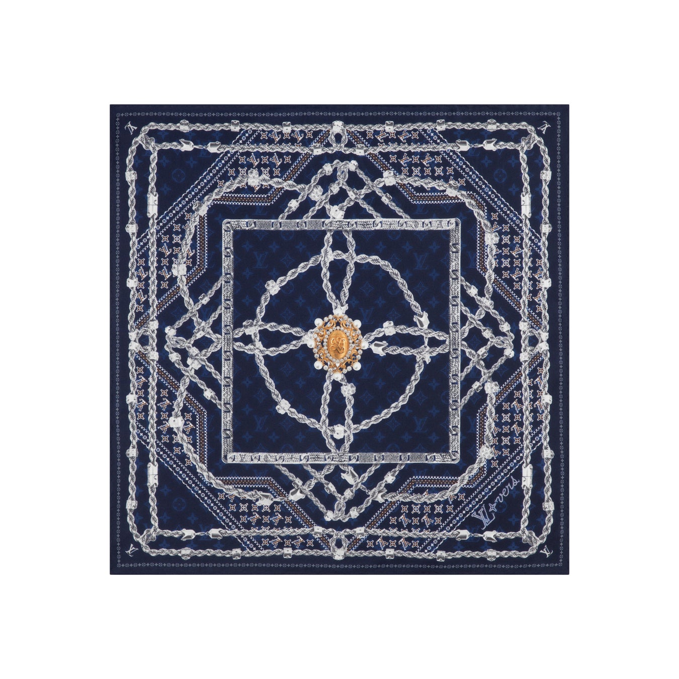 クラシカルなカウボーイのネッカチーフにラグジュアリーなひねりを加えたネイビーブルーの「カレ55·LV ダイナスティ」。シルク100%で仕立て、ファッションジュエリー·コレクションの「ブローチ·LV ダイナスティ」のグラフィカルなモンタージュの下には、トーナルなモノグラムが全面にあしらわれています。右下のコーナー部分を彩るロープ風に再解釈したLV ラバーズのロゴをはじめとするメゾンのシグネチャーも魅力。
