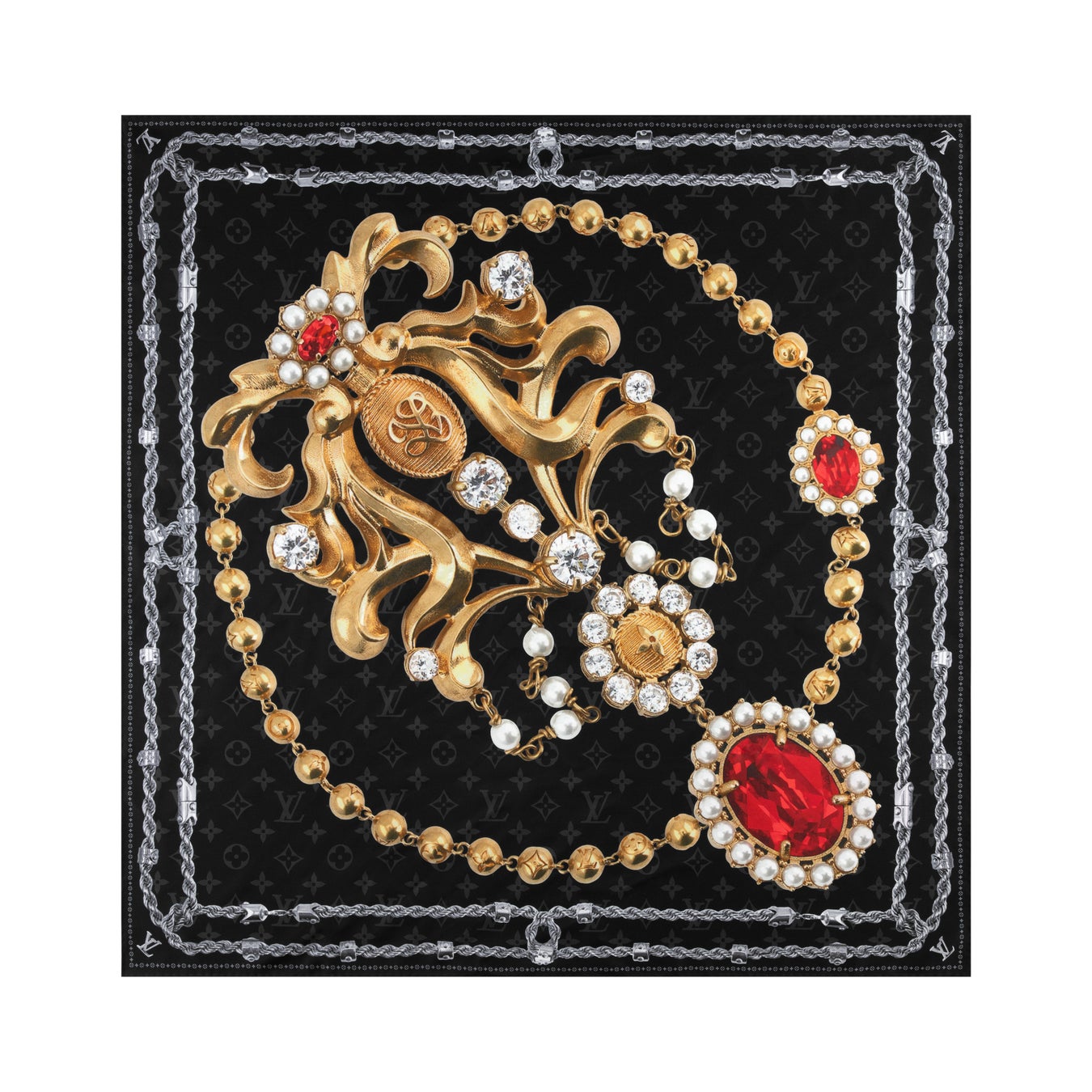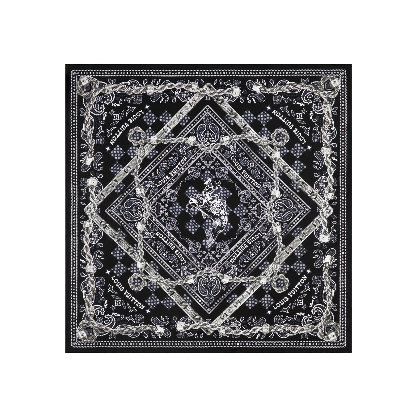 シルク100%の素材をグラフィカルなブラックに仕上げた「カレ90·LV ダイナスティ ブローチ」。クラシカルなカウボーイのネッカチーフにジュエリーを描き、洗練されたデザインでアップデートしました。2024秋冬ファッションショーのインスピレーション源となったダンディなウエスタンを取入れ、モノグラムをトーン·オン·トーンで全面にプリントし、インパクトを放つ巨大な「ブローチ·LV ダイナスティ」をはじめ、ルイ·ヴィトンのファッションジュエリーのグラフィカルなモンタージュをあしらいました。